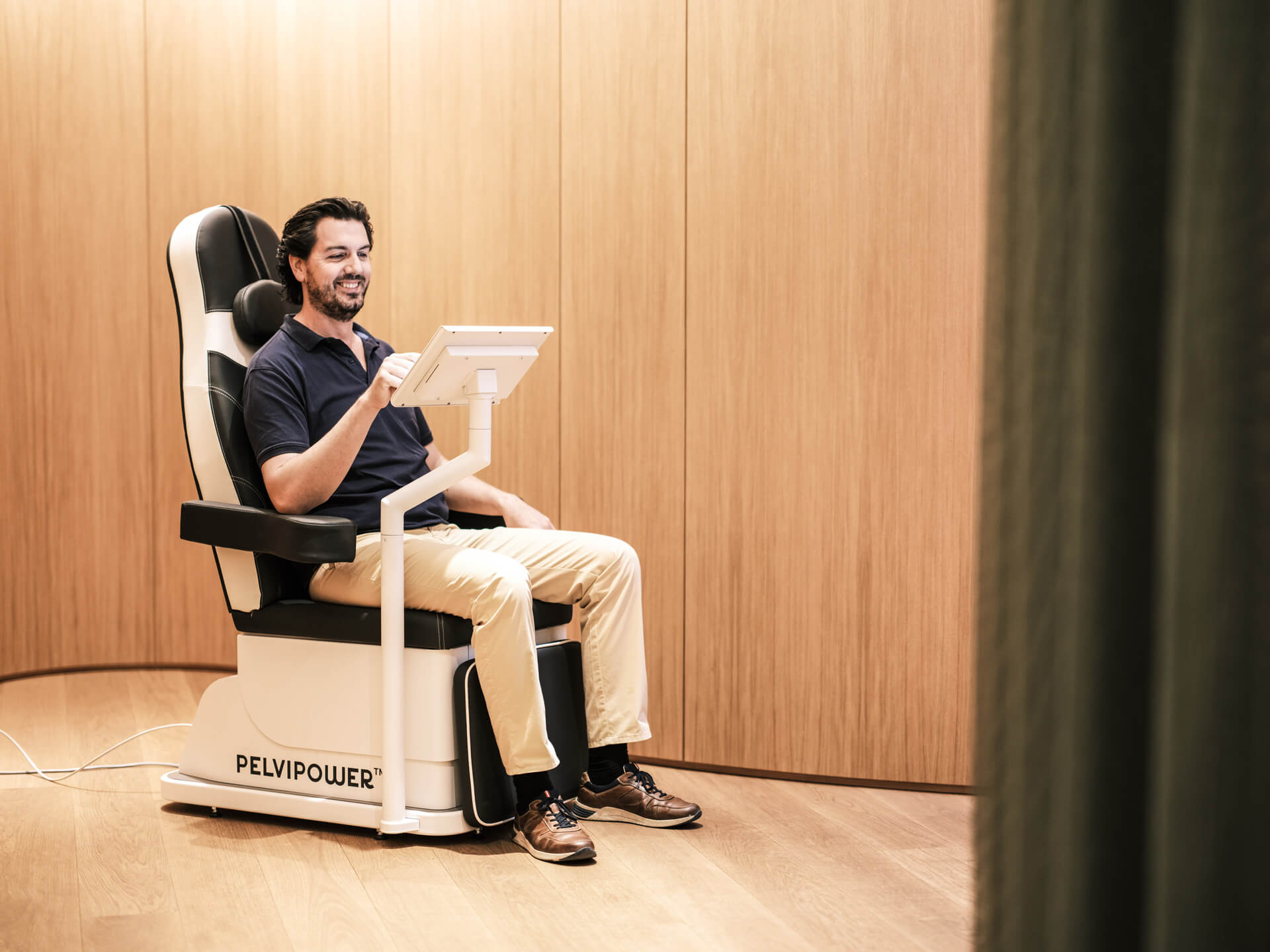 Die Anwendung mit PelviPower™ basiert auf elektromagnetischen Wellen, die vom Behandlungsstuhl an das Gewebe und die Muskeln des Kunden abgegeben werden, um dort Muskelkontraktionen zu erzeugen und somit die Beckenbodenmuskulatur zu stimulieren und zu kräftigen. Dies führt dazu, dass die Blasenkontrolle durch die gestärkte Beckenbodenmuskulatur verbessert wird.